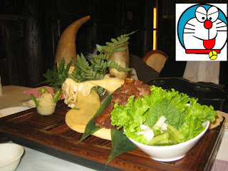 餐廳名字叫作趙記老鋪,餐廳的掛頭牌之作是一味喚作”牛氣衝天”的菜,不便宜的,菜一上桌,其賣相真的是先聲奪人,半個牛頭骨作伴碟裝飾,主角牛肉躺在一大堆配菜上。其實那主角牛肉是近似上湯煮熟的牛腩,包上生菜片及紫蘇葉,沾點醬油或鹽巴來吃。這一味”牛氣衝天”的菜也算好吃但不算驚為天人。至於其他的菜色也不算特別,嚐過便算增加經驗就是了。