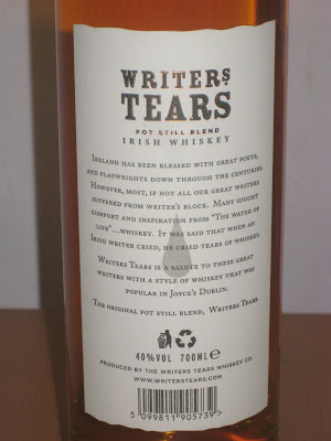 說回這款酒,它是由傳統的純銅壺蒸餾及麥芽威士忌調配,其中是沒有調入以連續式蒸餾器製作的穀物威士忌。雖則是以 ABV 40% 裝瓶,但聞說是沒有經過冷凝過濾的。酒精度低於 ABV 46% 的威士忌在低溫下酒中會凝結出結晶粒,令酒看上去較混濁,影響賣相但卻不影響酒質,反之受到講究的飲家的歡迎,因為冷凝過濾會濾走不少構成威士忌風味的酯類物質。一般非冷凝過濾的威士忌見於 ABV 46% 或以上的酒款,高酒精度可避免低溫下酒中凝結出結晶粒。Writers Tears 這種調配方式的酒款在市場上是比較少見的。