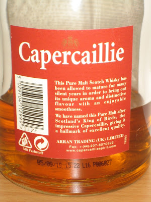 這品牌由 Arran Trading (UK) Limited 經營,不過和 Isle of Arran 的那所蒸餾廠應該沒有直接關係。這品牌及其威士忌在網絡上亦沒有詳細的資料及相關酒評。按公司網頁資料,這個品牌尚有四款調合威士忌,包括 Standard, Premium, Black Label 及 21 years old。就其公司介紹,從其贊助活動及分銷商資料推斷,這品牌的主要市場應該是我們的"強國",是故這品牌鮮見於其他的市場,小弟在深圳的免稅店見過這品牌的威士忌。小弟手上的這瓶酒是"酒餘",是小弟的老友留給小弟的。"骯港正苦"對推動廚餘做不出甚麼成績,不如由我們這些升斗市民由"酒餘"做起,每瓶酒不論平貴,留下150-200毫升,和酒友們交換分享,以較少金錢及健康的成本喝到較多的酒款,又可以互相交流酒評,這真是一個很好的"環保"運動,不過要找到不計較又大方的酒友是不容易的,如果每每計較誰的酒價貴,誰的"酒餘"量少,這可是很不爽的。於此多謝莊尼的"酒餘",期望日後有更多的"酒餘"酒評。