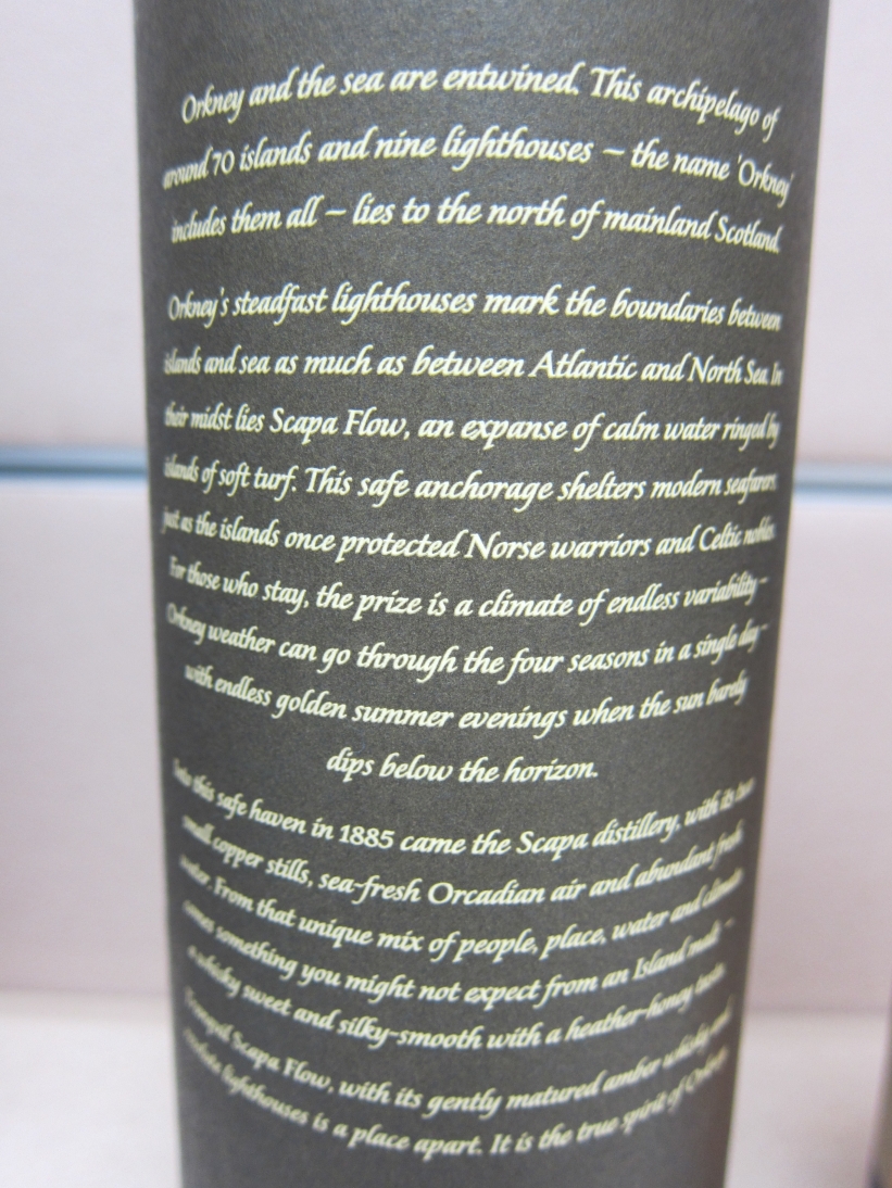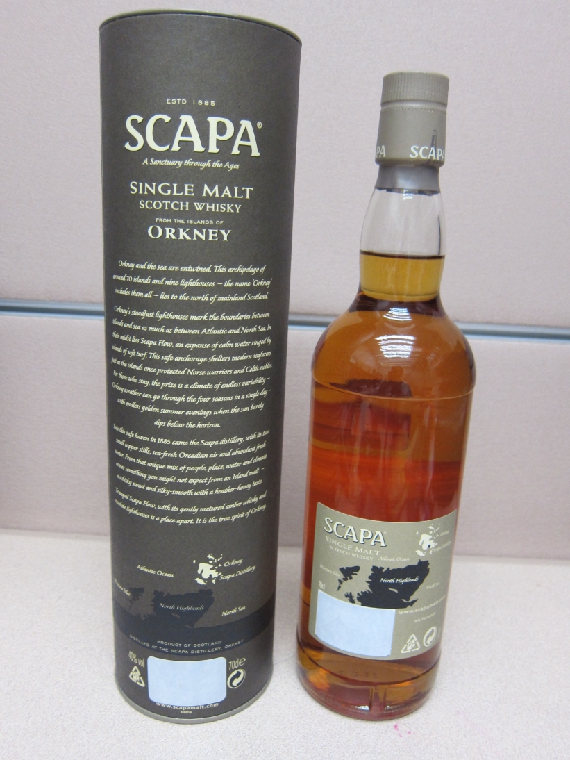 Scapa 雖則和 Highland Park 是近鄰,但他們出品的風格可算是南轅北轍,在葡萄酒流行的"風土"對他們來說可以說是反面的例子。Highland Park 以石南泥煤煙燻麥芽加上用雪莉桶陳年,造就其標籤的"石南"風味,雖則很多威士忌也有"石南"風味,但很多飲家一提起"石南"就會第一時間聯想起 Highland Park 的,其風格實在太深入民心,Highland Park 單一麥芽威士忌瓶裝的生意分分鐘比供應作調合威士忌的為大。Scapa 是其近鄰,但除了水源帶有的泥煤外,供應給 Scapa 的麥芽少有作泥煤煙燻處理,此外,Scapa 亦主要使用波本桶作陳年威士忌之用。單看其客觀的基本製作手法,可算是南轅北轍,就算未有品嚐他們的出品,也可估計到他們的風格上應該會有頗大的分別。
