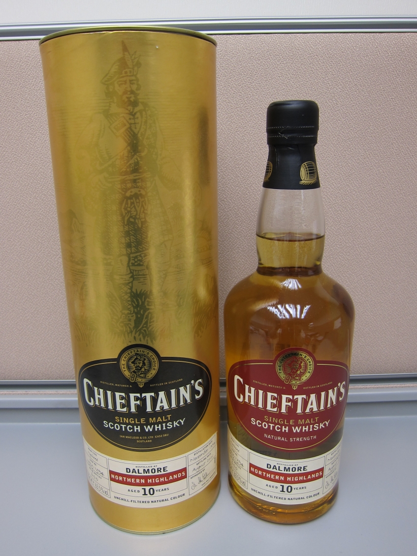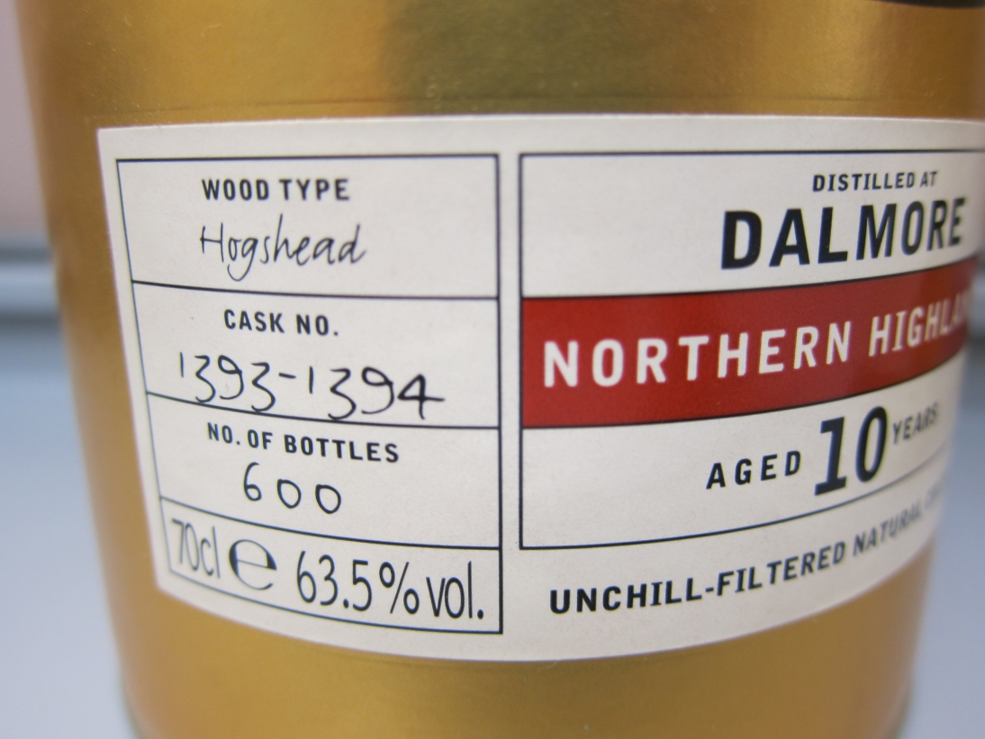 這是由 Ian Macleod 裝瓶的 Dalmore, 一九九四年蒸餾,由兩桶調合,二零零五年裝瓶,總數為六百瓶,標示為十年陳,酒精度高達 ABV 63.5%,和一般新酒裝瓶時的酒精度差無幾,未喝已經感覺到其"強勁"的力度了。這款酒獲 Jim Murry 在他的 Whisky Bible 2009 中給與 95.5/100 的高分。這款酒既有特色,又有大師的加持,怎不叫人充滿期望?